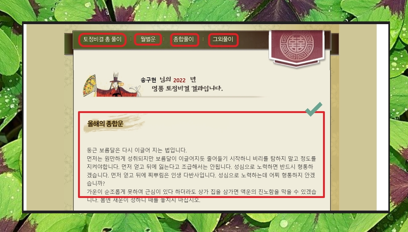 한해에 들어오는 연애, 직장, 건강, 금전 등 여러 분야의 해당하는 운세를 알아보는 것도 가능합니다.