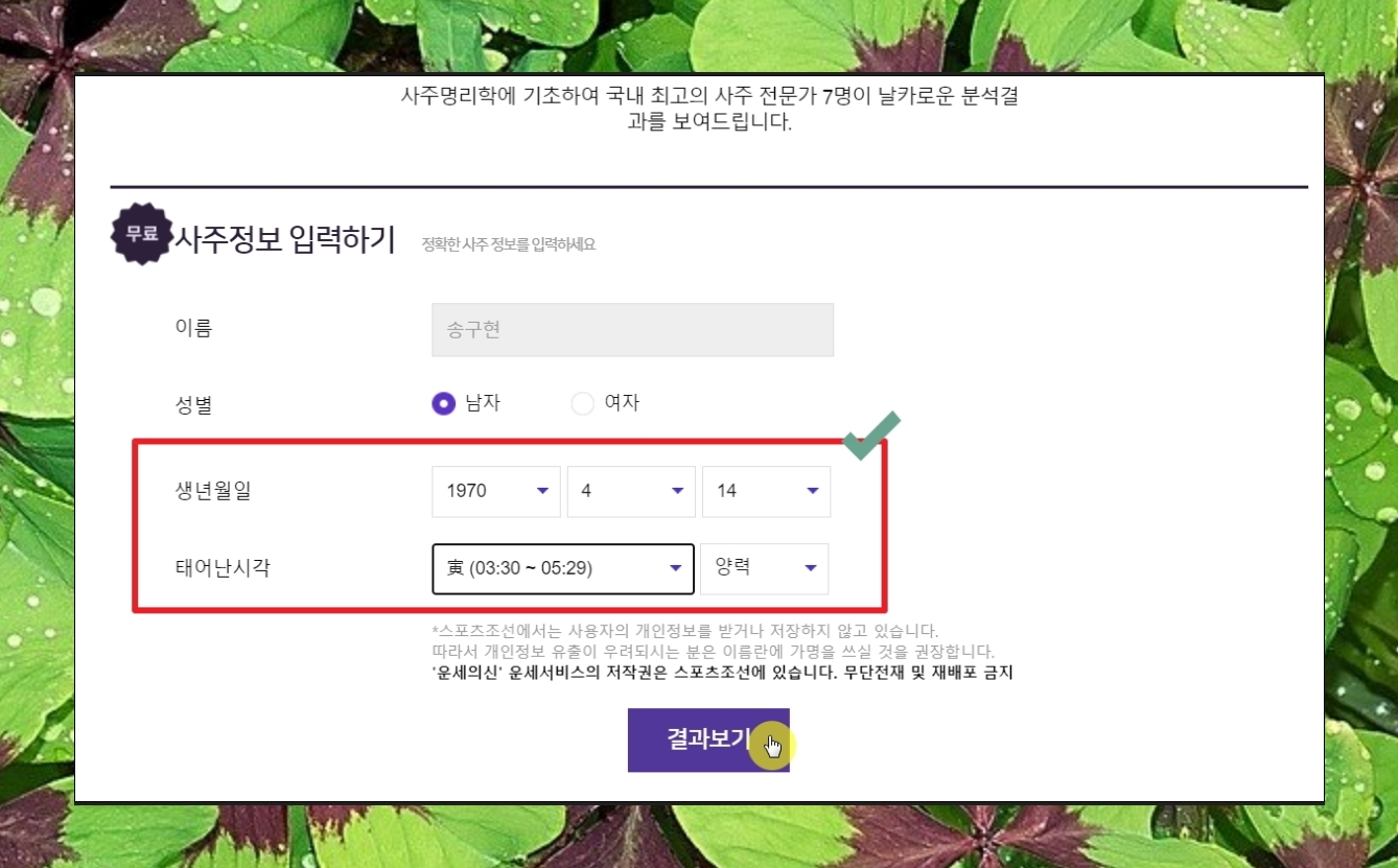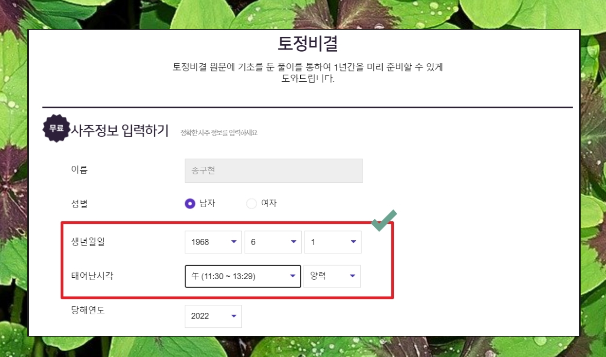 두 번째로 토정비결을 통해 무료 생년월일 운세 풀이를 보도록 하겠습니다. 여기서도 생년월일과 태어난 시각을 정확하게 입력해야 합니다.