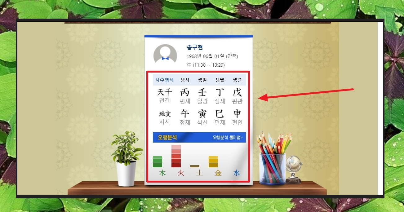이번 시간에는 두 가지 무료 역술 서비스 대해 알려 드릴 겁니다. 각자 장점이 다르기 때문에 함께 사용하면 더욱 좋고, 필요에 따라서 선택적으로 사용해도 좋습니다. 사람의 생년월일은 다음과 같이 사주 정보를 포함하고 있습니다. 이를 통해 오행을 분석하거나 앞으로의 일들을 살펴볼 수 있죠.