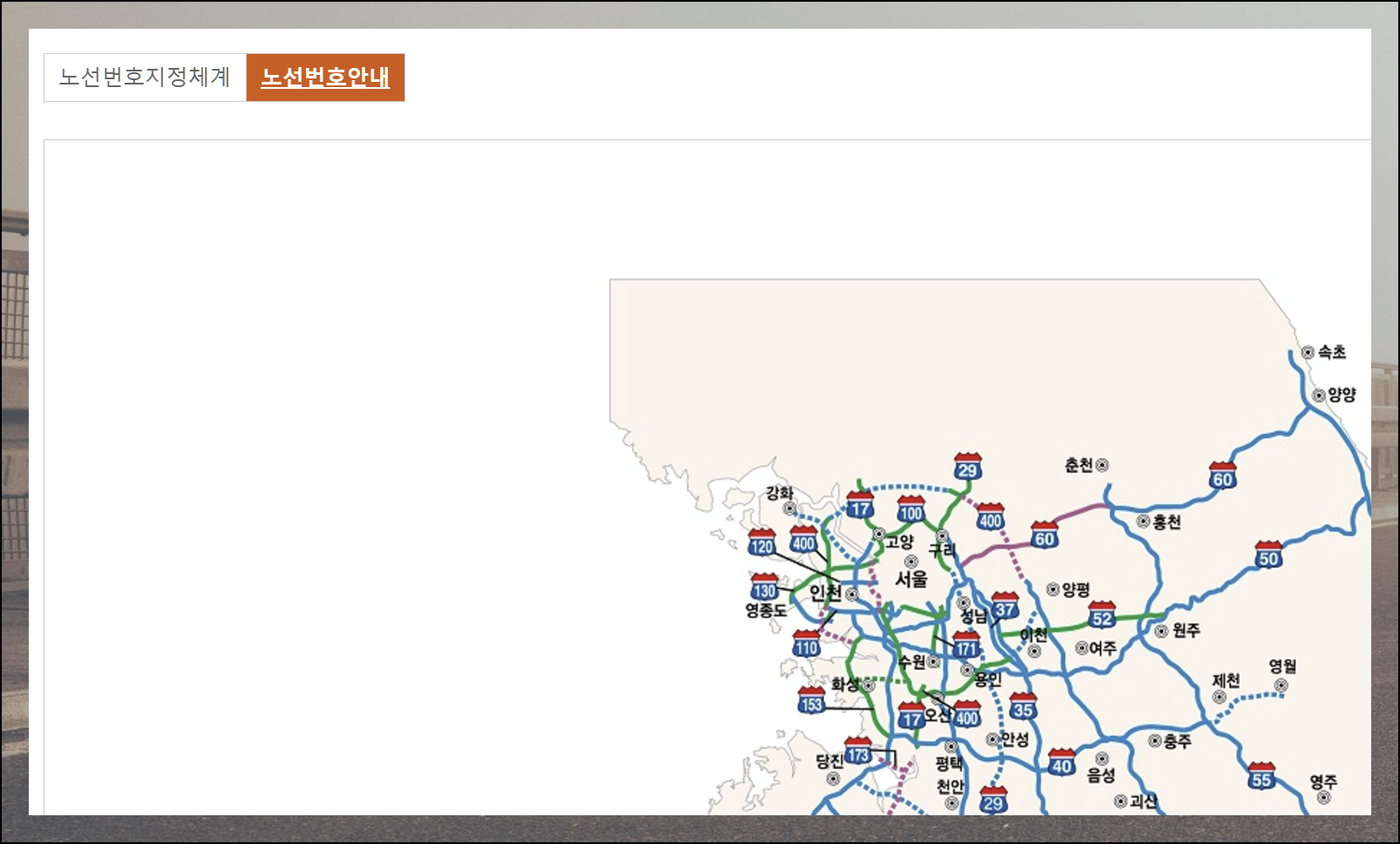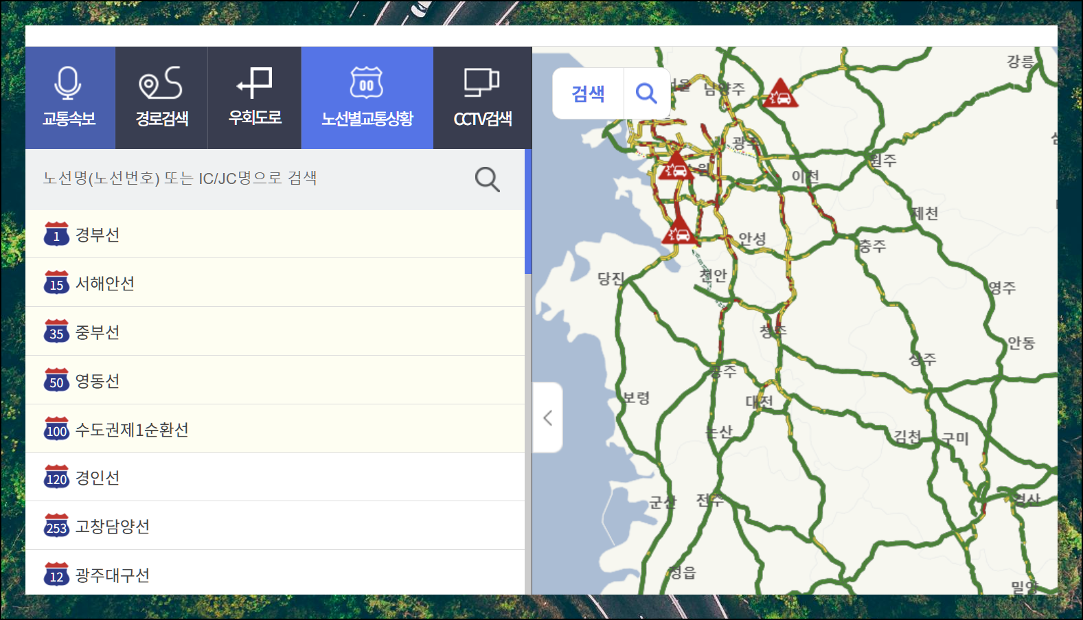 경부선을 선택하면 수도권에서 영남권까지 이어지는 전국 고속도로망을 지도로 한눈에 볼 수 있습니다.