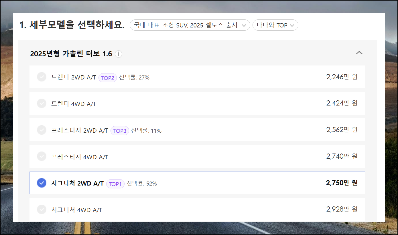 견적서 작성은 4단계로 이루어져 있어요. 첫 번째로 원하는 자동차의 세부 모델을 선택합니다. 어떤 종류를 고를지 고민된다면 인기 모델 TOP3를 참고하세요.