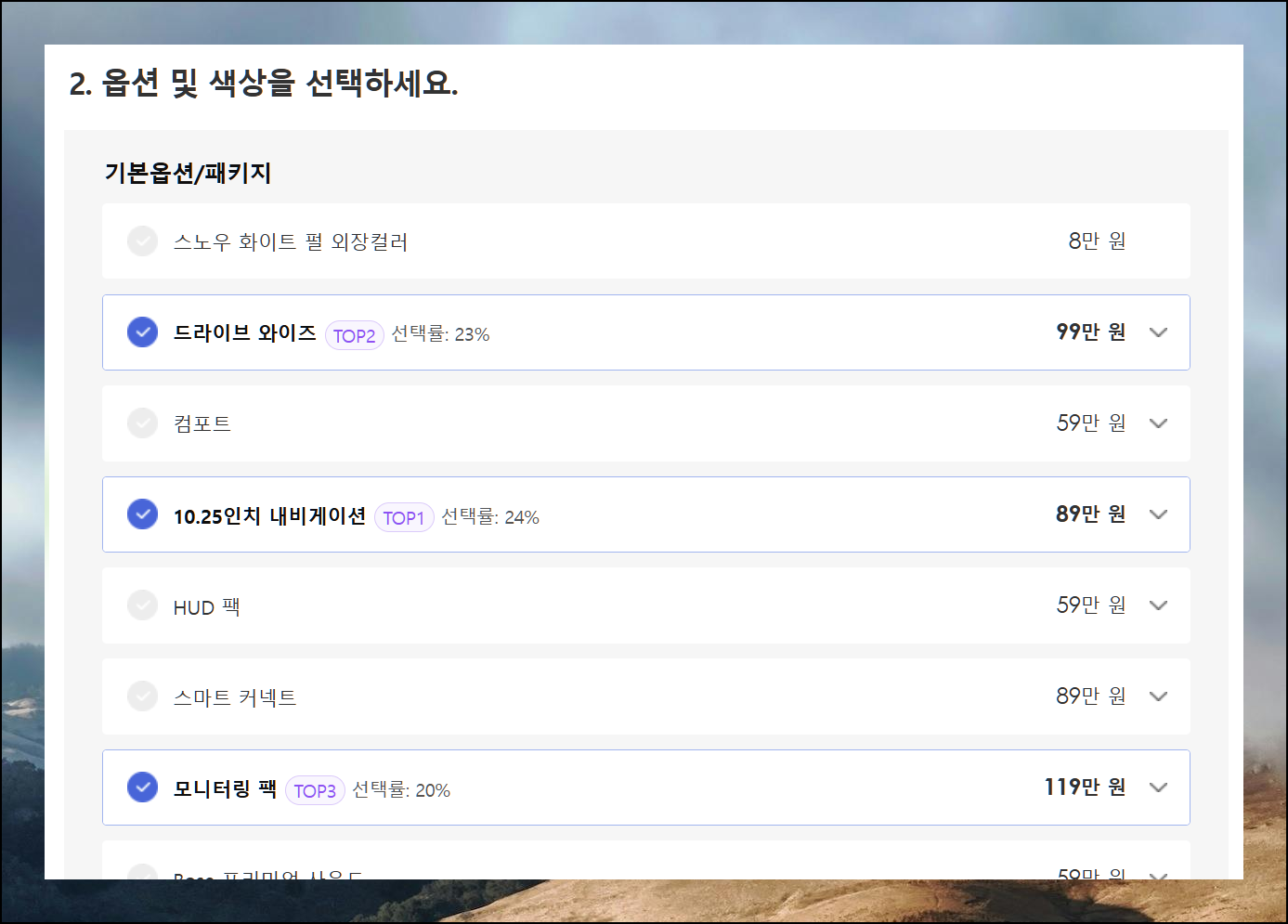 기아자동차만의 특별한 옵션들 중 원하는 기능을 모두 선택하면서 나만의 차를 완성해보세요.