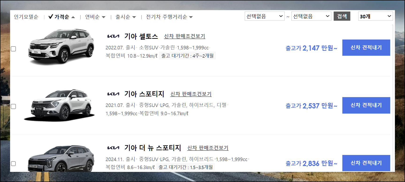 검색 결과에서는 각 차종의 상세 정보와 가격을 확인할 수 있어요. 인기 모델순으로 정렬하면 많은 사람들이 선택한 기아 suv를 쉽게 찾을 수 있습니다.