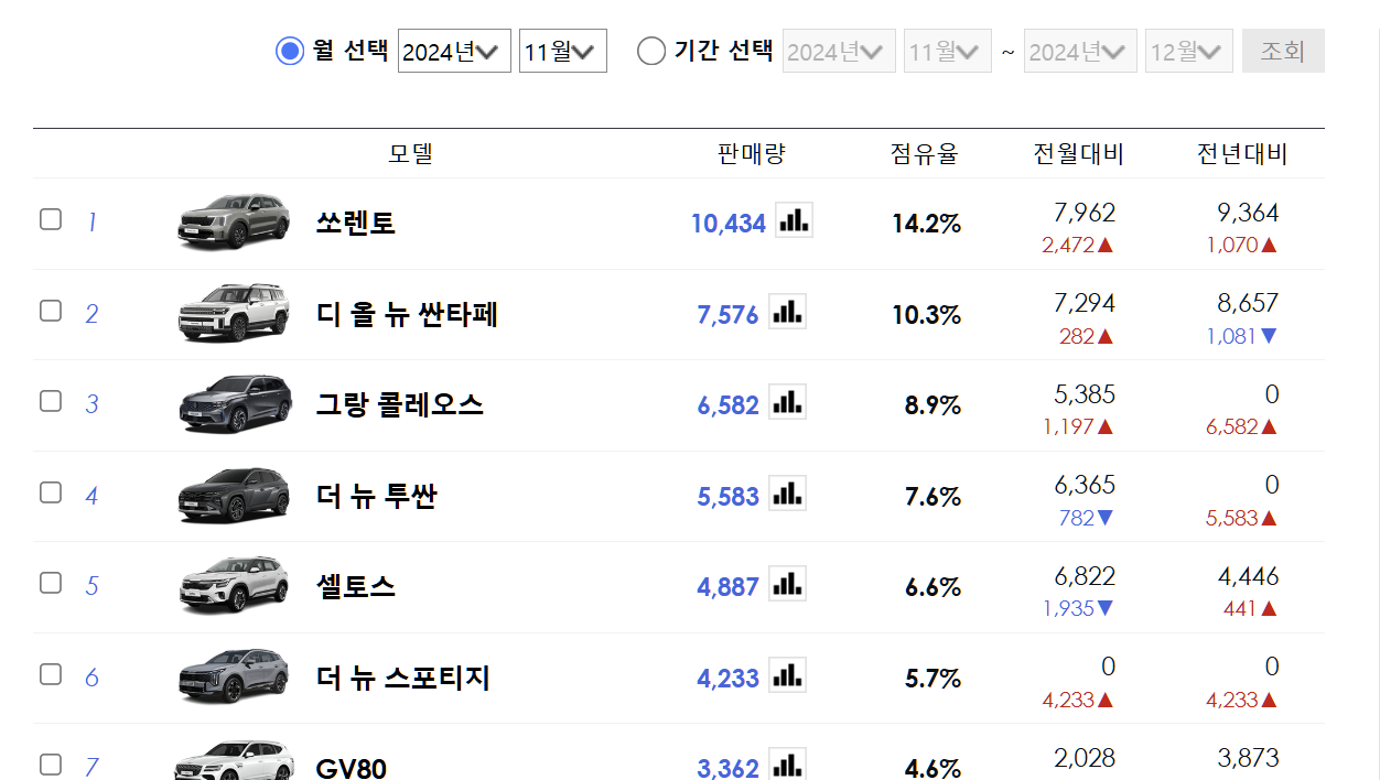 가장 최근 판매 데이터를 기준으로 기아자동차의 suv 라인업과 차종별 특징을 살펴보았어요. 2024년 11월 기준으로 쏘렌토가 당당히 1위를 차지했습니다. 그 뒤를 이어 디 올 뉴 싼타페와 그랑 콜레오스가 각각 2, 3위를 기록했어요. 특히 주목할 만한 점은 스포티지와 쏘렌토의 판매량이 작년에 비해 크게 증가했다는 사실입니다.