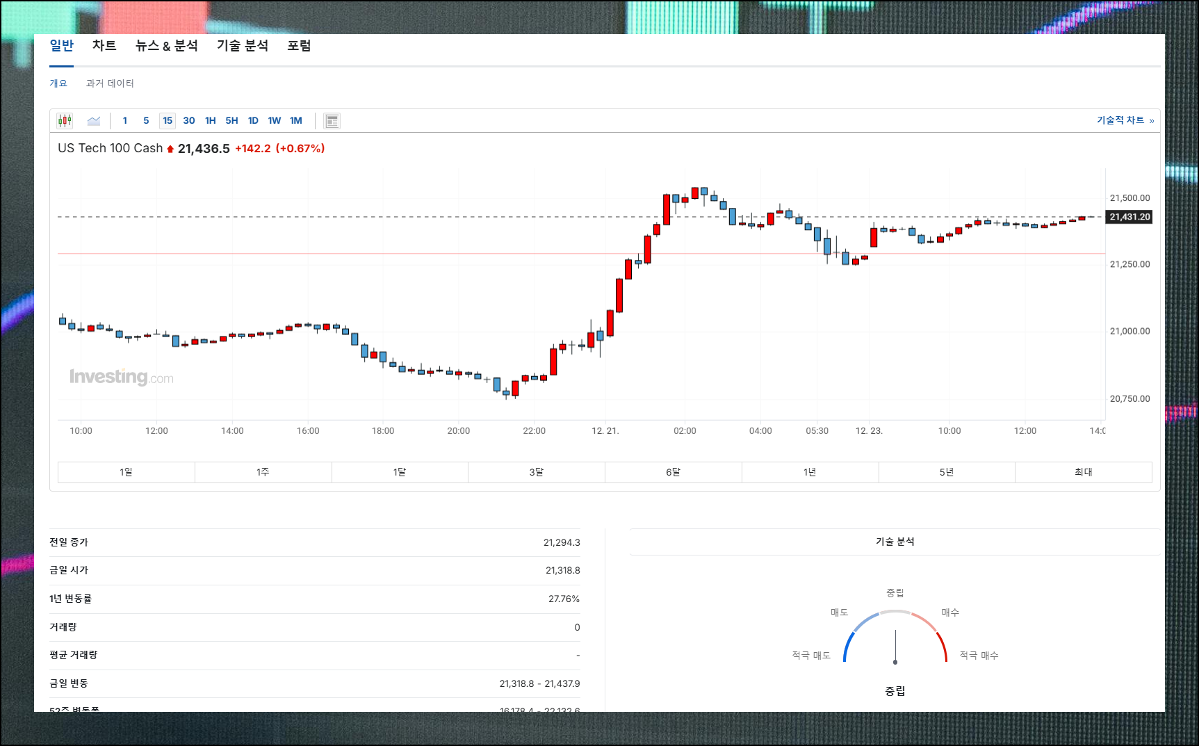 나스닥 100을 예시로 들어볼까요? 기본적인 차트는 물론이고 전일 종가나 시가 같은 핵심 정보를 한눈에 볼 수 있어요. 실시간 선물지수 변동과 함께 기술분석이나 관련 뉴스도 제공되니 투자 결정에 도움이 될만한 정보가 가득합니다. 미국 시장의 흐름을 파악하기 위한 다양한 메뉴가 준비되어 있어요.