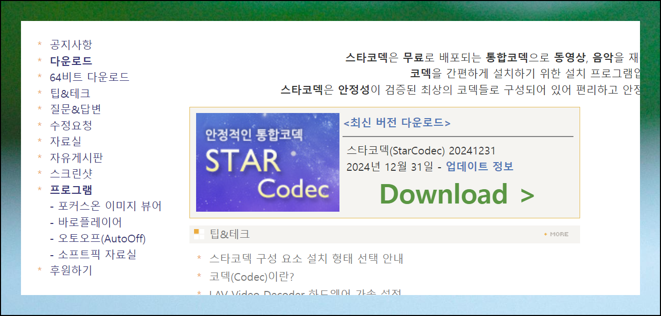 우선 스타코덱을 다운로드 받아야 하는데요. 인터넷 검색창에 스타코덱이라고 입력하면 공식 홈페이지를 쉽게 찾을 수 있습니다. 통합코덱설치를 위해 홈페이지에 들어가면 2024년 12월에 새롭게 업데이트된 최신 버전이 여러분을 기다리고 있어요. 다운로드 버튼이 눈에 잘 띄는 곳에 있으니 쉽게 찾을 수 있습니다.