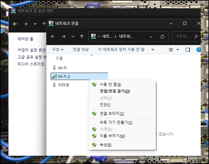 활성 네트워크 창에서 데이터 통신 아이콘을 찾아보세요. 인터넷에 문제가 있을 때에는 이 아이콘이 보이지 않을 수 있어요. 문제가 지속된다면 어댑터 설정 변경 메뉴로 이동해주세요.