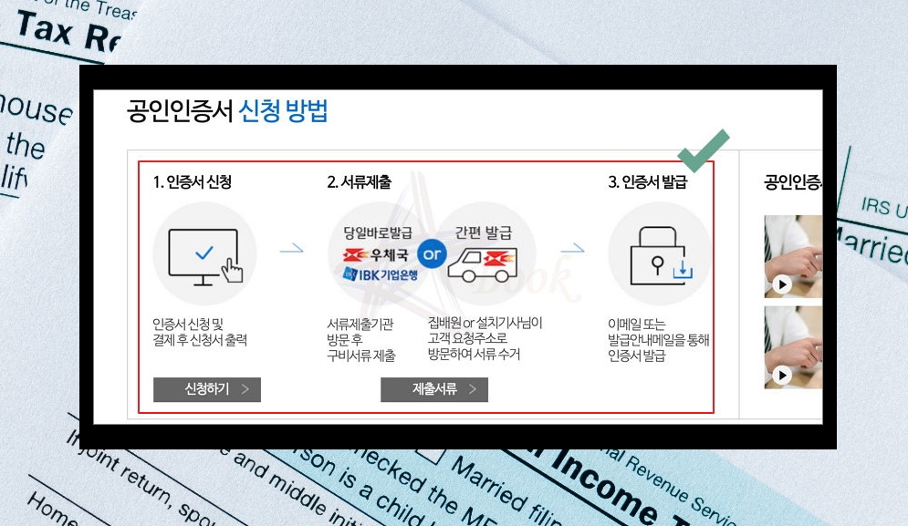 이를 신청하고 발급을 받는 과정을 설명해 드릴게요. 방금 한 것과 같이 인터넷으로 신청서 작성과 결제를 진행해 주세요. 그 다음 서류를 준비해서 관련 기관에 방문하여 제출하면 돼요. 방문이 어려운 경우에는 집으로 방문을 요청할 수도 있어요. 서류 제출 과정이 끝나면 전자세금계산서용 공인인증서가 들어있는 이메일을 받을 수 있어요. 해당 메일을 통해 완료를 하면 돼요.