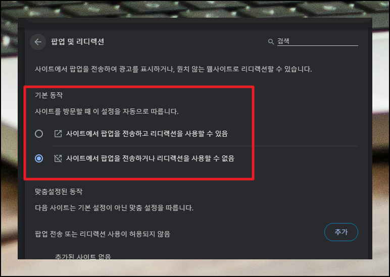 콘텐츠 영역에서 "팝업 및 리디렉션"이라는 메뉴를 찾아보세요. 현재는 대부분의 사이트에서 새 창이 열리지 않도록 차단되어 있습니다. 이제 원하는 방식으로 변경을 해보세요.