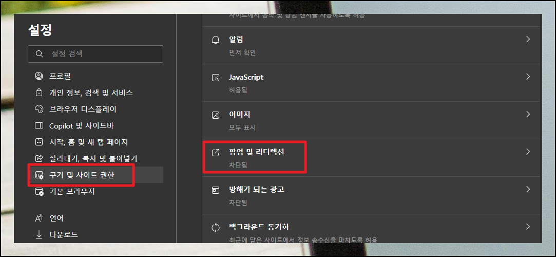 엣지에서도 비슷한 방식으로 설정할 수 있습니다. 점 3개 버튼을 누르고 쿠키 및 사이트 권한으로 이동해 주세요. 팝업 설정 방법은 크롬과 크게 다르지 않아요.