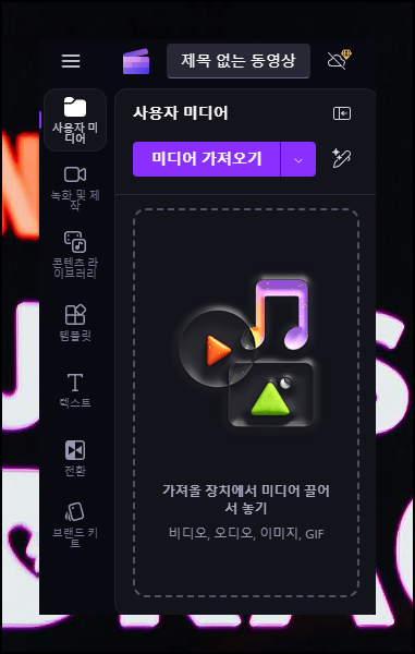 동영상 제작의 첫 단계는 미디어 요소를 추가하는 것입니다. 드래그앤드롭으로 쉽게 파일을 가져올 수 있어요. 사진, 비디오, 음악 등 다양한 미디어 파일을 추가해 보세요.