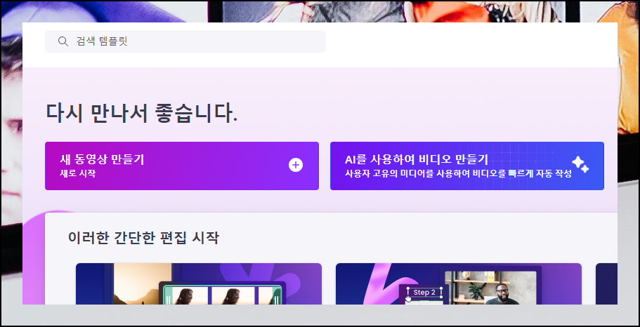프로그램은 두 가지 방식으로 시작할 수 있습니다. 다양한 템플릿을 활용하면 동영상을 빠르게 만들 수 있어요. 직접 작업과 AI 도움 중에서 선택해보세요.