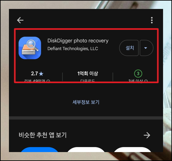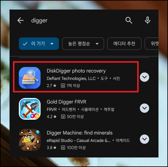 구글 플레이 스토어에서 "digger"를 검색해보세요. 'digger photo recovery' 앱을 찾을 수 있을 거예요. 이것을 통해 어떤 파일이든 핸드폰 안에 들어 있는 것을 손쉽게 복원할 수 있습니다.