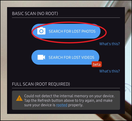 어플리케이션 실행 후 'search for lost photos' 버튼을 누르세요. 파일 접근 권한을 요청하면 '허용'을 선택해주세요. 이 과정은 핸드폰 사진 복구를 위해 꼭 필요합니다.