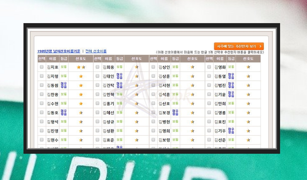 제가 자주 사용하는 사이트를 활용하시면 위와 같이 연생과 성씨에 따라 300개의 성명을 무료로 살펴볼 수 있습니다. 리스트를 보시면 아시겠지만, 등급과 선호도를 기준으로 순위가 매겨져 있는데요. 여기에 더하여 좋은 한자까지 추천받을 수 있습니다.