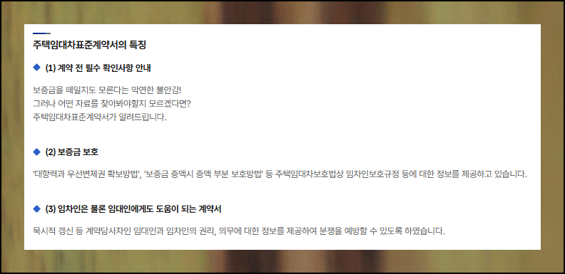 신뢰할 수 있는 정부기관이 제공하는 표준 임대차 서식으로 안전하게 부동산 계약을 진행할 수 있어요. 복잡한 법률 내용이나 별도의 교육 없이도 누구나 쉽게 활용할 수 있도록 구성되어 있습니다.