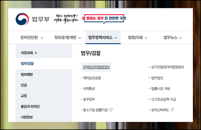 고객 편의를 위해 법무부는 각종 민원 업무와 함께 유용한 자료들을 한곳에 모아두었어요. 부동산 임대차에 관련된 모든 것이 "법무 정책 서비스"에 마련되어 있습니다. 이곳에서는 계약서 쓰는법에 관련된 정보도 얻을 수 있어요.