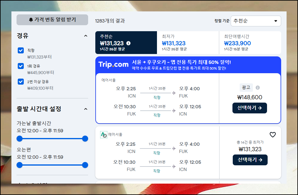 지금 찾은 요금이 마음에 들지 않나요? 더 합리적인 금액을 원한다면 화면 왼쪽 상단의 '가격 변동 알림 받기' 기능을 활용해보세요. 이 서비스는 기다리는 동안 더 좋은 특가를 발견할 기회를 높여줍니다. 시즌 오프나 프로모션 기간에는 더 큰 할인을 기대할 수도 있어요.