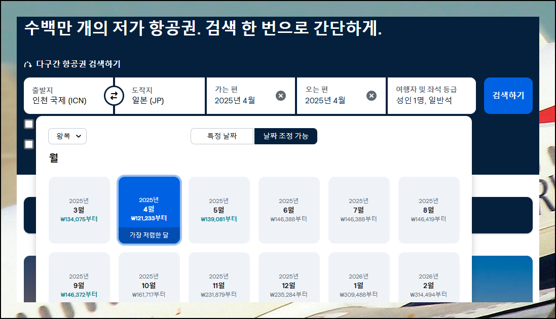 예를 들어, 4월 21일 출발 시 귀국 날짜 23일로 정하면 싸게 비행기표 구입하는 것이 가능해요. 이런식으로 최적의 여행 계획을 위해 출발 티켓과 귀국 티켓 비용의 합이 가장 낮은 조합을 찾으세요. 하루만 일정을 조정해도 금액이 크게 달라질 수 있으니, 여러 옵션을 시도해보는 것이 해외 항공권을 싸게 구입하는 것도 좋습니다.
