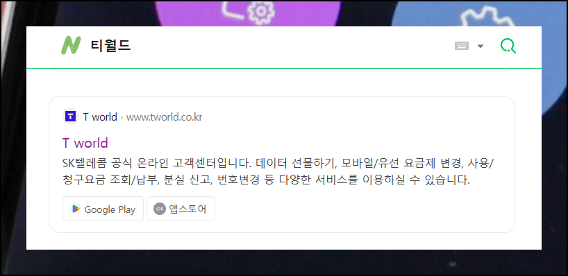티월드 페이지에 접속하면 화면 오른쪽에 "검색" 아이콘이 있습니다. 이 버튼을 누르고 "컬러링"을 입력한 후 엔터키를 누르세요. 여기서 우리가 찾는 서비스가 바로가기 영역에 보입니다.