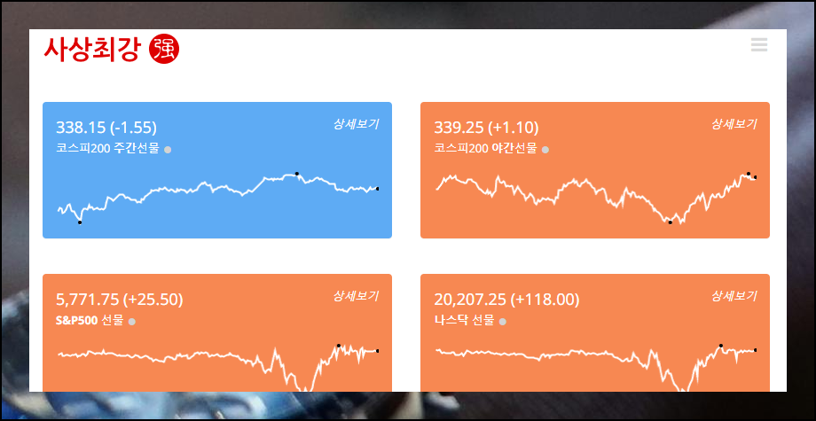 초기화면에 접속하면 여러 지수를 선택할 수 있는 메뉴가 표시돼요. 코스피 200 주간선물부터 우리가 찾는 코스피 200 야간선물지수, 그리고 미국의 S&P500과 나스닥 지수까지 여러 서비스를 제공합니다. 실시간으로 원하는 항목을 클릭하여 바로 정보를 확인해보세요.