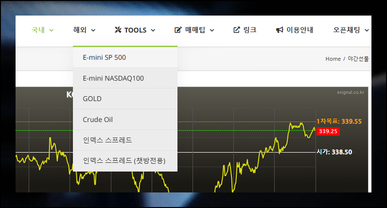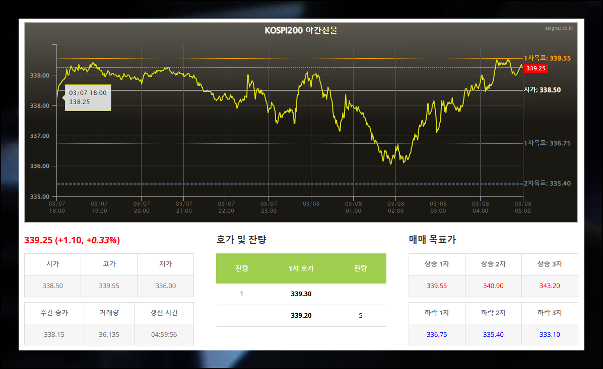 원하는 서비스를 선택하면 시간대별로 변동하는 야간선물지수 차트가 나타나요. 현재 가격뿐 아니라 1차 목표, 시가 내용도 함께 점검할 수 있습니다. 코스피 장이 종료되는 오후 6시부터 그래프 조회가 가능하니 참고하세요. 실시간 데이터로 다음날 장 분위기를 사전에 예측해보세요.