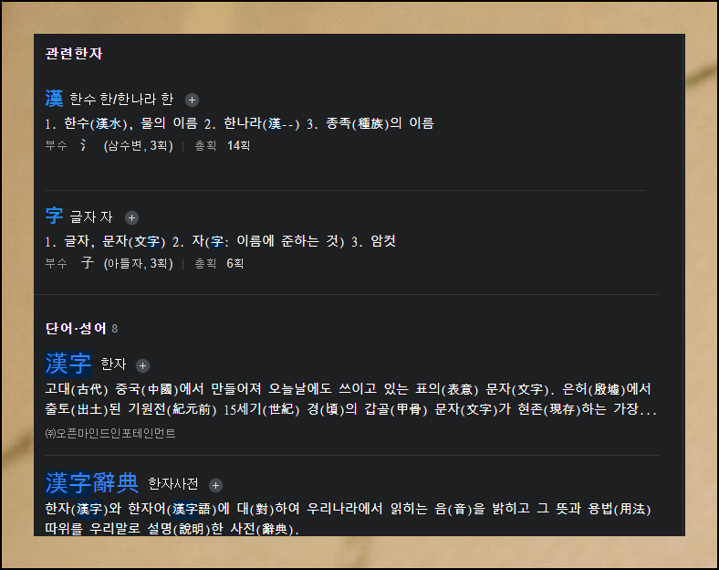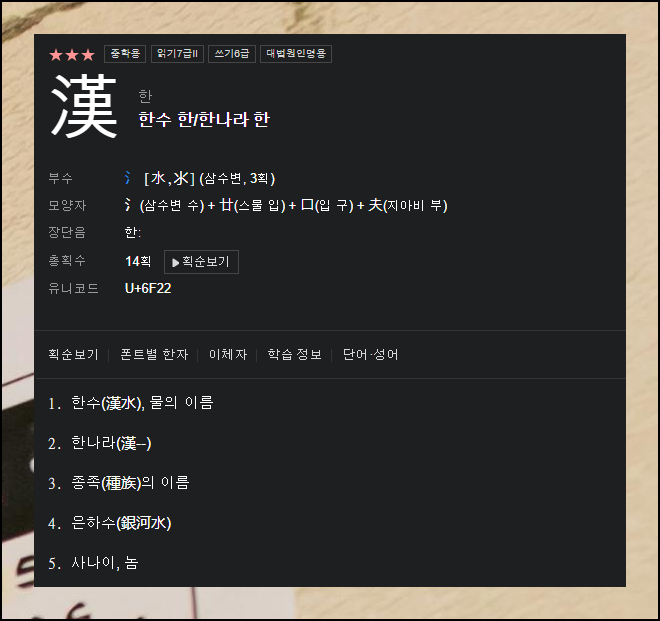 조회 결과에는 관련 문자, 어휘, 고사성어까지 추가로 제시됩니다. "한수 한"자를 클릭하면 해당 한자와 연관된 더 많은 내용을 둘러볼 수 있어요. 연계 검색을 통해 어휘력을 자연스럽게 향상시킬 수 있답니다.