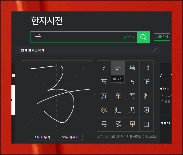 모양을 그려서 한글 음과 함께 풍부한 뜻을 알아볼 수도 있습니다. 메인 화면의 [필기 인식기 아이콘]을 누르면 마우스로 직접 글자를 그려서 검색할 수 있는 기능이 제공됩니다. 생소한 문자를 마주했을 때 특히 유용한 서비스예요.