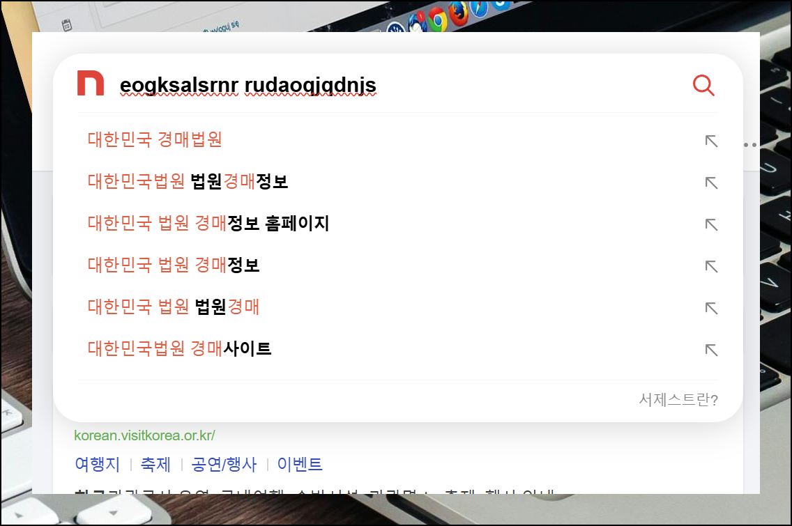 온라인에서 공공기관 사이트를 검색하려고 했는데 예상치 못한 문제가 발생했어요. 키보드 자판을 눌러 '대한민국 경매법원'이라는 내용을 입력했는데, 한글이 전혀 입력되지 않고, 영어만 나타나는 거예요. 검색 엔진에서 자동으로 한글 변환을 도와주긴 하지만, 근본적인 해결이 필요합니다.