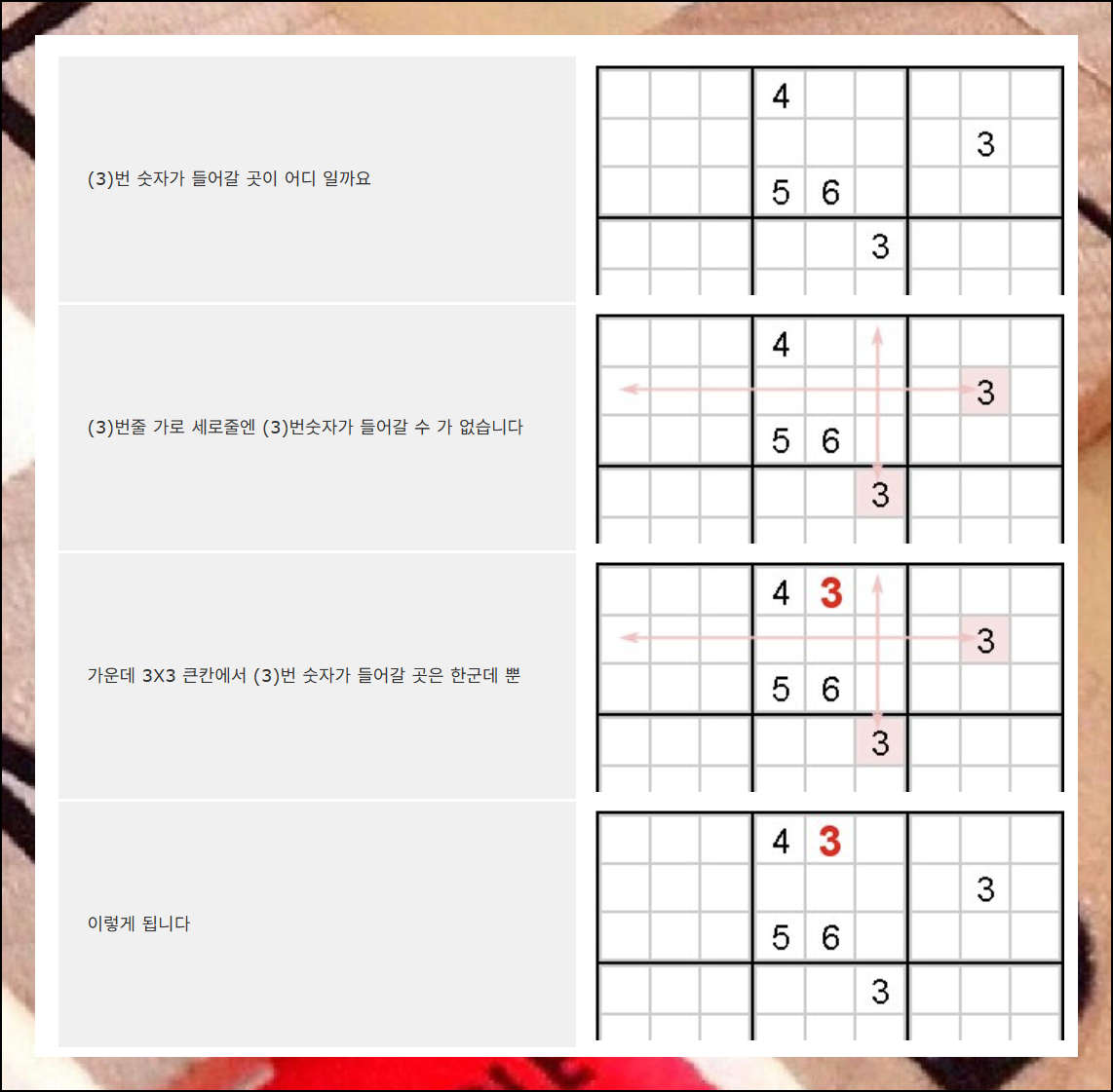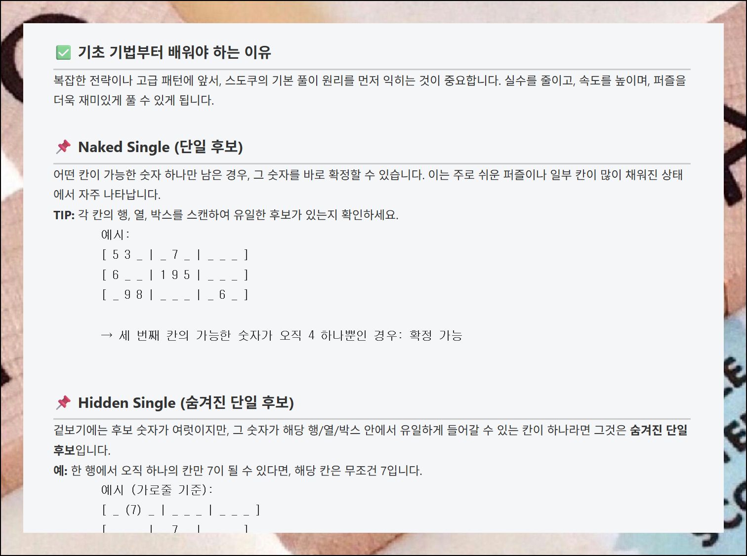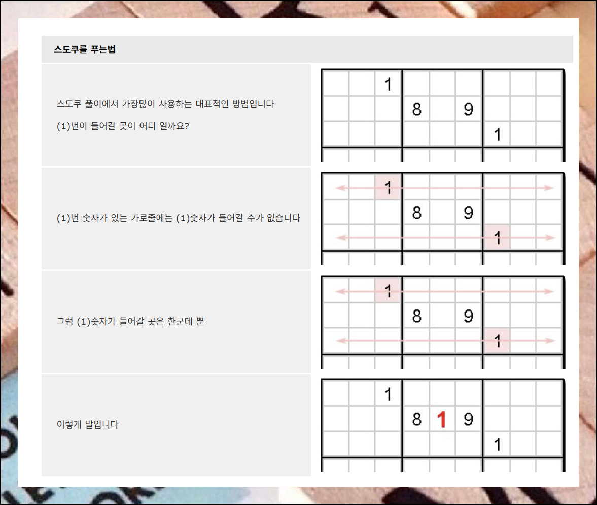 게임 진행 방법에 대한 설명이 정말 자세하게 되어 있어요. 처음 방문하는 사람도 쉽게 이해할 수 있도록 단계별로 안내해줍니다. 이 설명을 천천히 읽어보면 스도쿠코리아에서 경험할 수 없는 깊은 매력을 더 잘 느낄 수 있을 거예요.