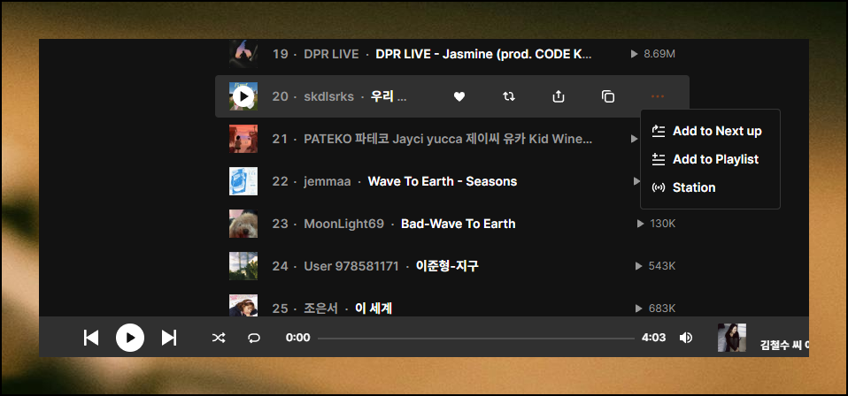 회원가입 절차 없거나 번거로운 과정 없이도 바로 감상이 가능한 것이 특징이에요. 더 다양한 기능을 원한다면 회원가입을 고려해보세요. 홈페이지 메인 화면 중앙에 있는 검색창에 들을 곡의 제목이나 아티스트 이름을 입력하면 됩니다. 보유하고 있는 곡 수가 상당히 많고 새로운 음악들이 지속적으로 업데이트되기 때문에 원하는 노래를 찾을 가능성이 높아요.