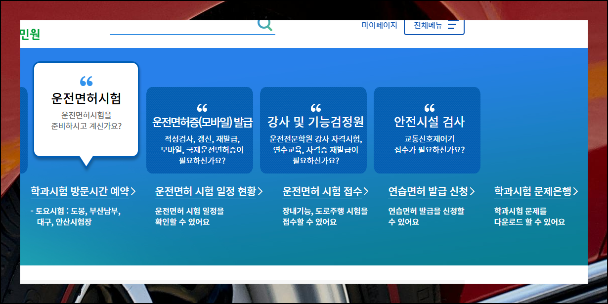 웹사이트에 접속하면 메인 화면 중앙에 배치된 메뉴들을 확인할 수 있어요. 여기서 운전면허시험 항목을 먼저 클릭한 다음, 학과시험 문제은행을 선택하면 됩니다. 이 간단한 두 단계만 거치면 공식 예상문제 자료에 바로 접근할 수 있으며, 사용자 친화적으로 설계된 인터페이스 덕분에 처음 방문하는 분들도 쉽게 원하는 내용을 찾을 수 있어요.