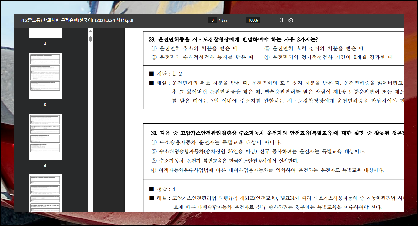 원하는 게시물을 선택하면 운전면허 필기시험 예상문제를 다운로드할 수 있는 버튼이 화면에 나타나게 됩니다. 이 버튼을 클릭하면 PDF 형태의 파일을 컴퓨터에 저장할 수 있어요. 다운로드가 완료된 파일은 더블클릭으로 간편하게 열어볼 수 있으며, 만약 문서가 정상적으로 열리지 않는다면 무료 PDF 뷰어 소프트웨어를 설치해야 합니다. 인터넷에서 다양한 무료 뷰어 프로그램을 검색해서 쉽게 구할 수 있어요. 보통 어도비에서 제작한 것을 많이 사용합니다.