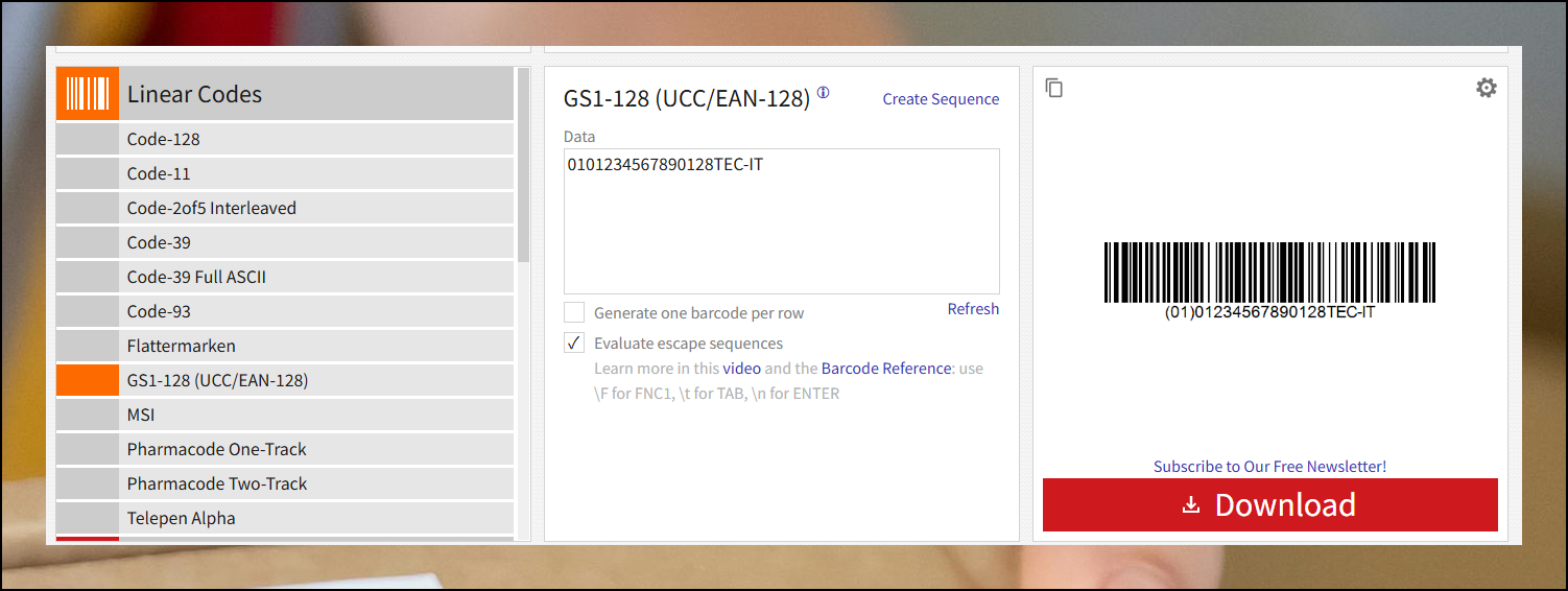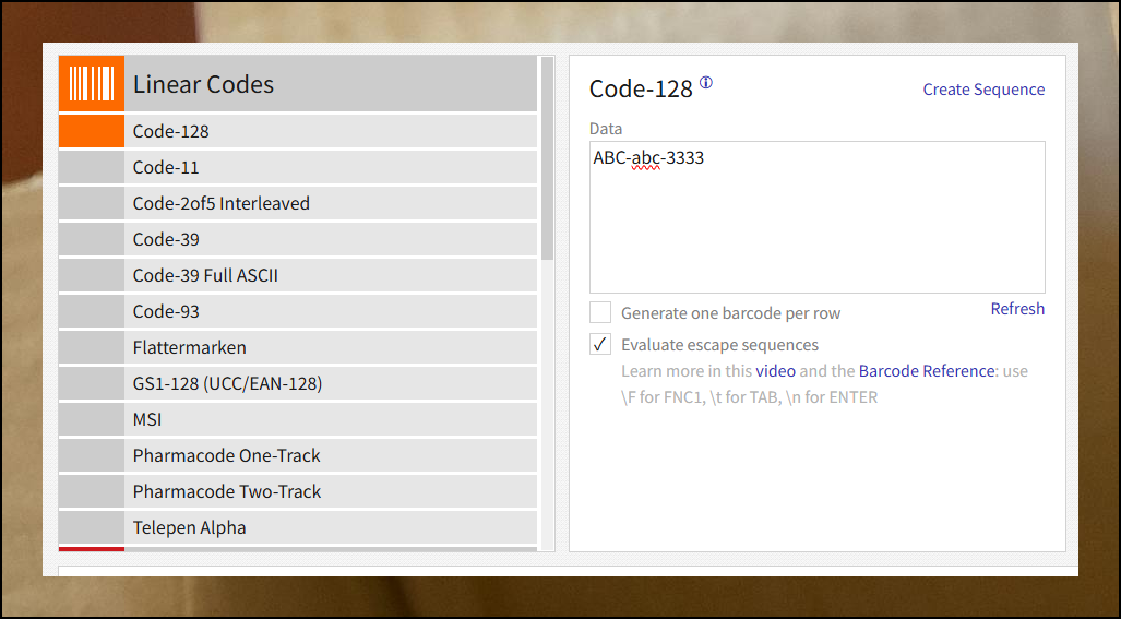 숫자뿐만 아니라 글자도 함께 담을 수 있는 제작법을 설명드릴게요. linear barcodes 메뉴를 열어보시면 훨씬 많은 옵션들을 확인할 수 있어요. 이 중에서 gs1-128을 택하시면 숫자와 영어 문자를 동시에 포함한 바코드를 만들 수 있습니다.