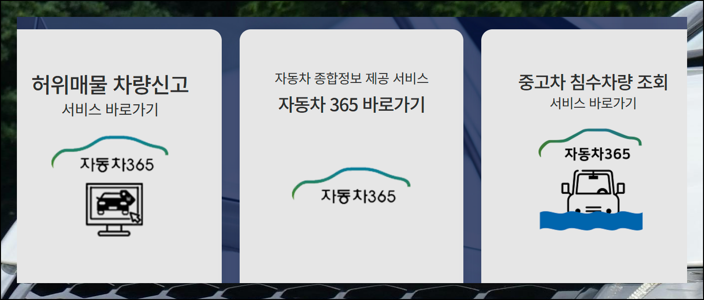 자동차365 혹은 카365 홈페이지에 들어가면 중고차 이력조회 서비스 이용은 물론이고, 관련 정보를 쉽게 찾을 수 있어요. 첫 화면에서 허위매물 신고나 침수차 체크 같은 편리한 기능들을 볼 수 있죠. 사고 기록을 확인하고 싶다면 자동차365 바로가기를 클릭하면 됩니다.