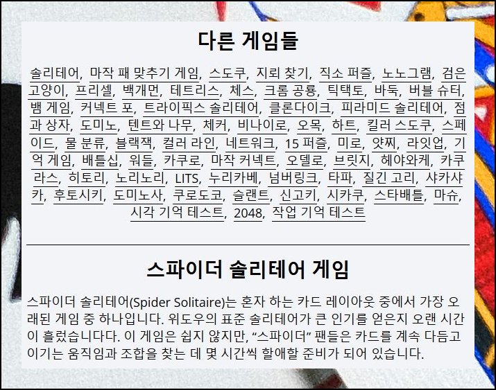 포털에 스파이더 카드놀이라고 입력해 보세요. 우리말로 잘 구성된 페이지를 어렵지 않게 발견할 수 있습니다. 원하는 링크나 썸네일을 탭하면 바로 게임 첫 화면으로 넘어가요. 접속 즉시 별도 절차 없이 플레이가 가능합니다. 회원가입도 따로 필요하지 않아요.