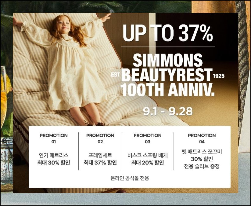 시몬스 공식 웹사이트에서는 때마다 다양한 혜택을 내놓고 있어요. 얼마 전 결혼 시즌 한정 행사로 침대 매트리스, 프레임, 룸세트, 침구류를 저렴하게 구입할 수 있었습니다. 우수한 품질의 침대 제품을 부담 없이 들일 수 있던 좋은 기회였죠. 프레임 규격도 빼놓지 말고 확인하세요. 해당 모델은 SS에서 GK까지 다섯 단계 사이즈 규격으로 세팅되어 있습니다.