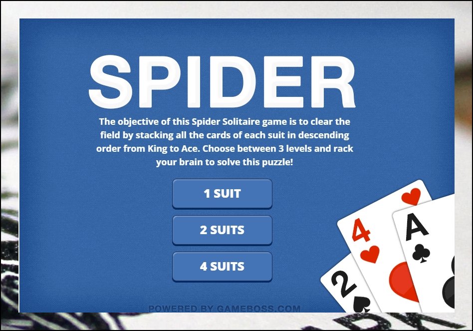 스파이더 게임을 열면 세 종류의 난이도가 제시돼요. 경험이 적은 분이라면 1 SUIT 모드부터 시작하길 권합니다. 방식을 체득하고 기반을 쌓기에 알맞은 구간이에요. 손에 익으면 상위 레벨에 도전해 보세요.
