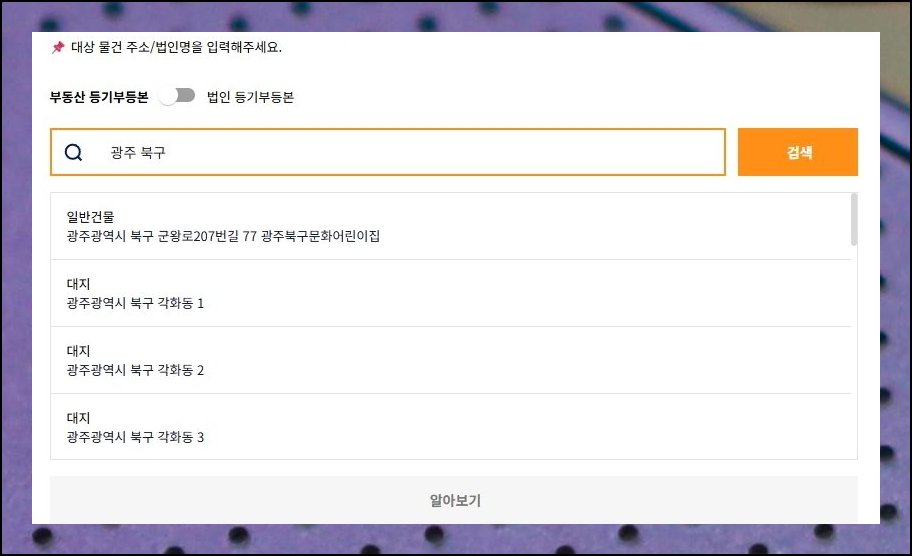 광주 북구를 넣어보니 해당 권역의 물건 리스트가 순식간에 떴어요. 그중 상세 내역을 파악하고 싶은 대상을 선택해주세요. 조회 버튼을 한 번 누르면 됩니다. 인터넷에서 이렇게 간단한 절차만 밟으면 원하는 등기부등본에 곧장 접근이 가능해요.