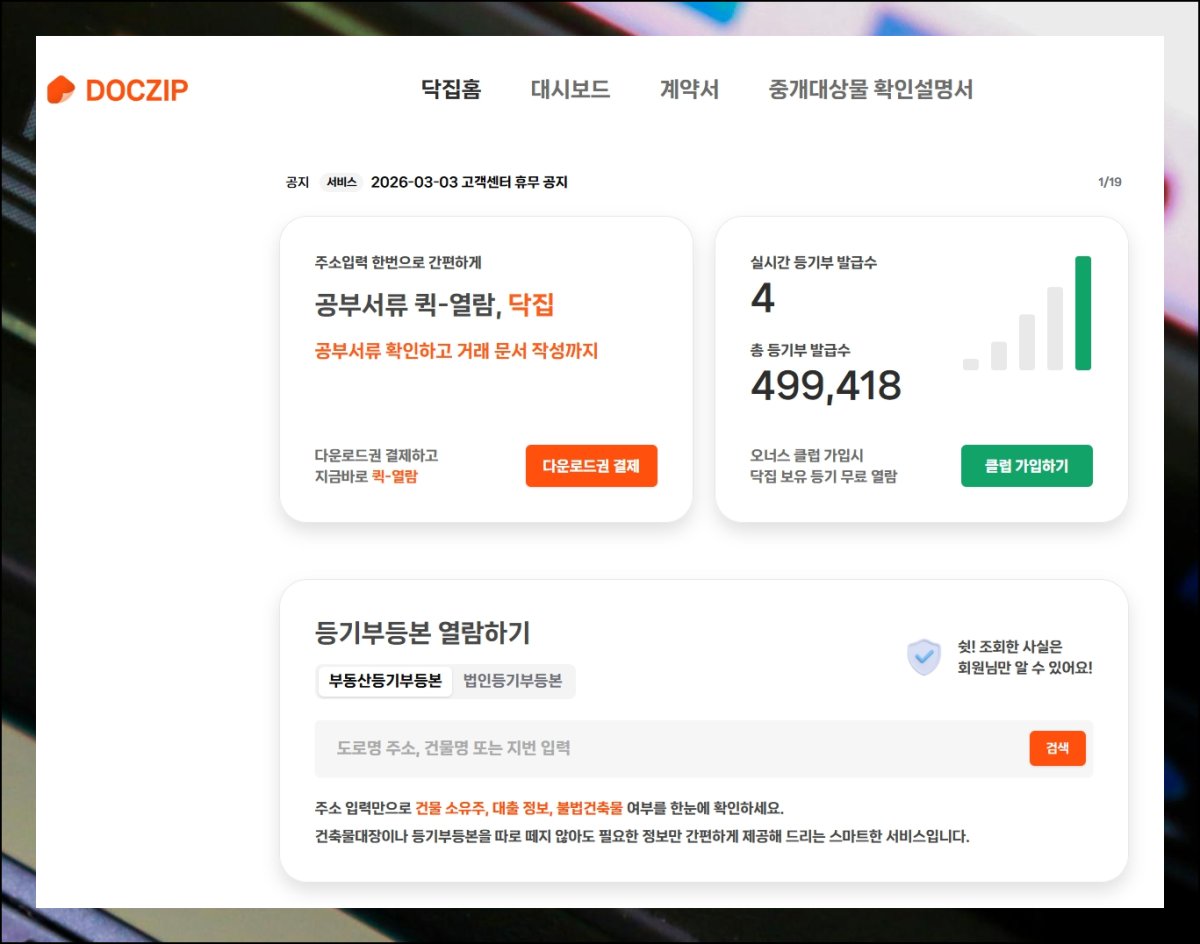 무료열람을 원한다면 닥집이라는 인터넷 플랫폼을 써보세요. 등기부등본 외에도 각종 공적 기록물을 한 곳에서 탐색할 수 있습니다. 해당 위치만 넣으면 보유자가 누구인지, 법적 하자가 있는지 등 핵심 내역이 즉각 나타나요. 네트워크만 잡히면 어디서든 자유롭게 접속 가능하죠.