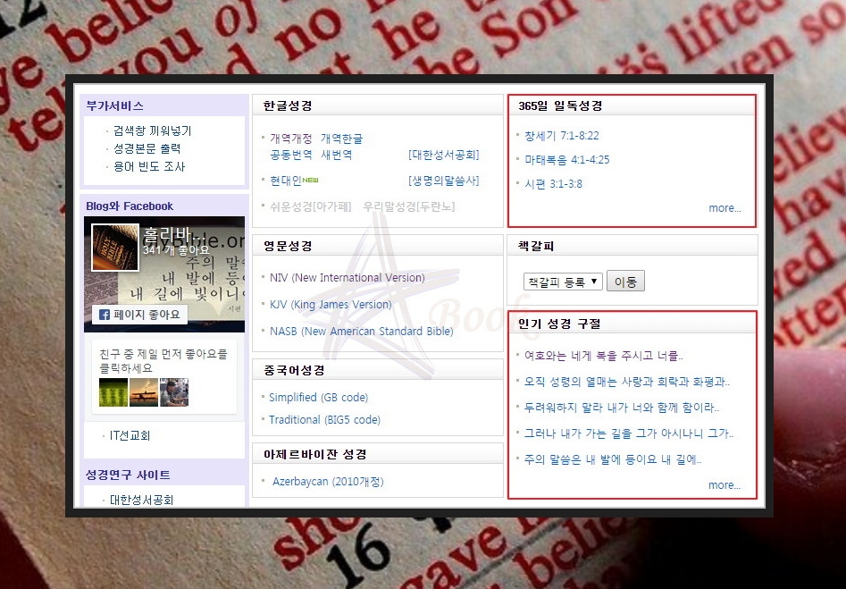 따로 마련되어 있는 메뉴를 이용해보세요. 마음에 쏙 드는 구절들이 많습니다. 이뿐만 아니라 매일마다 읽고 싶으신 분들은 '365일 일독성경'을 이용하시면 도움이 많이 되실거에요.