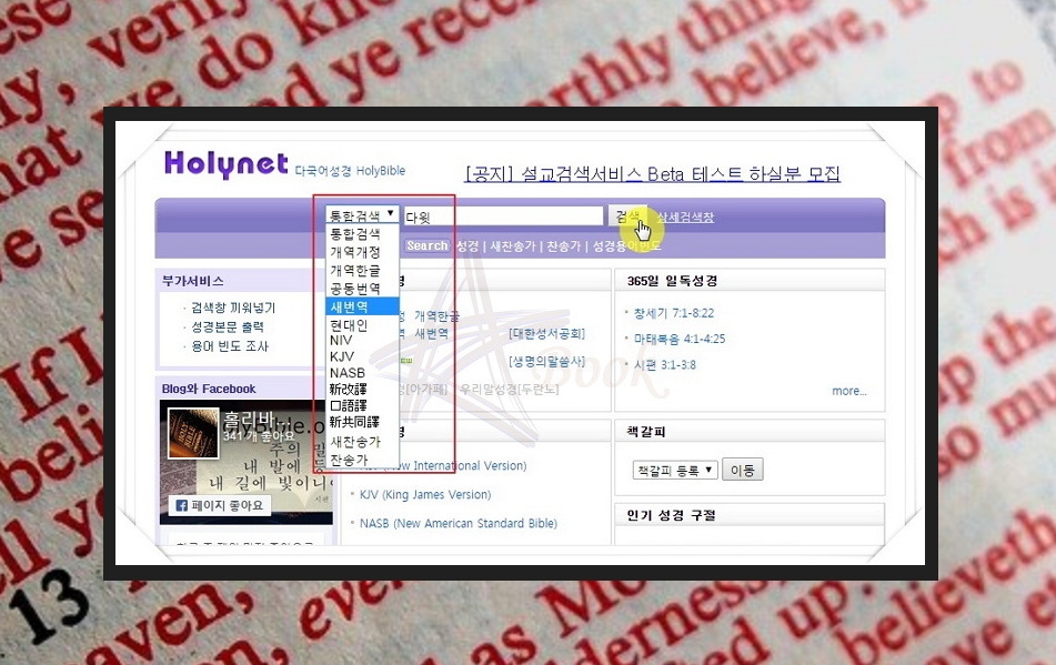 요즘에는 책보다 스마트폰이나 컴퓨터를 이용하여 텍스트를 읽는 사람들이 많은 것 같아요. 성경책의 경우에는 두꺼운 책을 가지고 다니는 것보다 스마트폰이나 테블릿 PC를 이용하여 보는 것이 나을 수도 있는데요. 이번 시간에는 여러 가지 버전의 성격책을 읽는 것은 물론이고, 찾고 싶은 구절을 쉽게 찾기 하는 방법을 알려드리도록 하겠습니다. 한글은 물론이고, 영문으로 된 버전도 읽기 가능합니다.