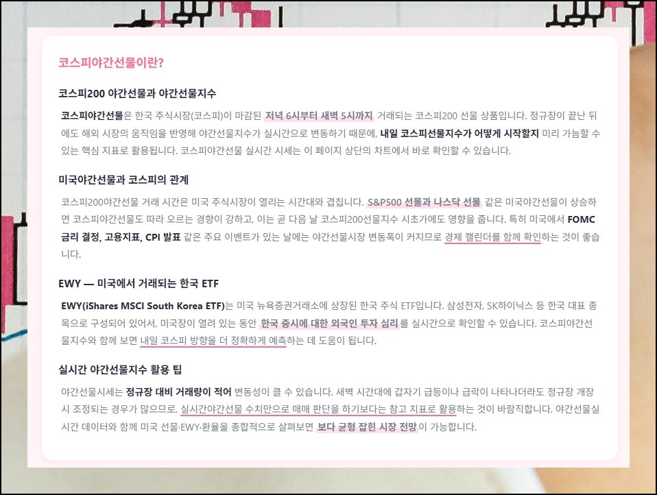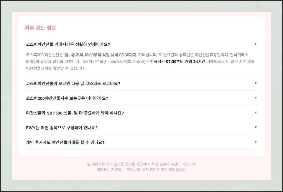 잠들기 전 야간 선물 수치를 살피는 루틴은 단순 조회를 넘어섭니다. 해외 장세와 국내 지수가 톱니처럼 맞물리는 감각이 길러지고 개장 전 준비도 단축돼요. 매일 5분씩 꾸준히 들이면 코스피200 흐름을 포착하는 눈이 자라나고 장기적으로 더 정교한 선택이 가능해집니다.