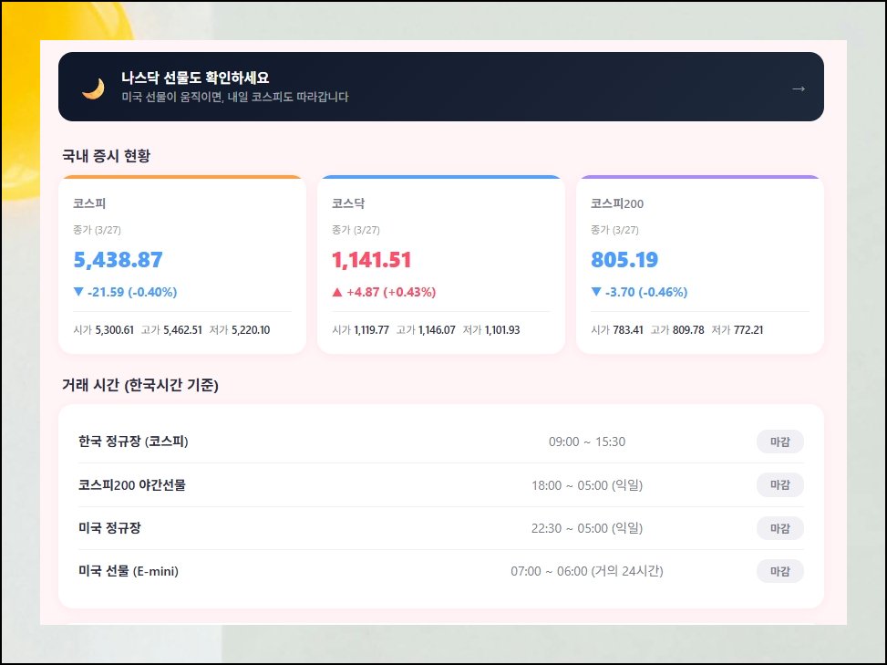 코스피, 코스닥, 코스피200 현황이 타일 블록으로 단정하게 정리된 보는곳입니다. 주요 지수끼리 빠르게 견주기 편해요. 하단에는 국내 정규장과 야간 거래, 미국 시장별 개폐 시각이 한국 기준으로 안내됩니다. 운영 중인 마켓과 마감된 마켓이 구분되어 주목할 대상을 즉시 골라낼 수 있어요.