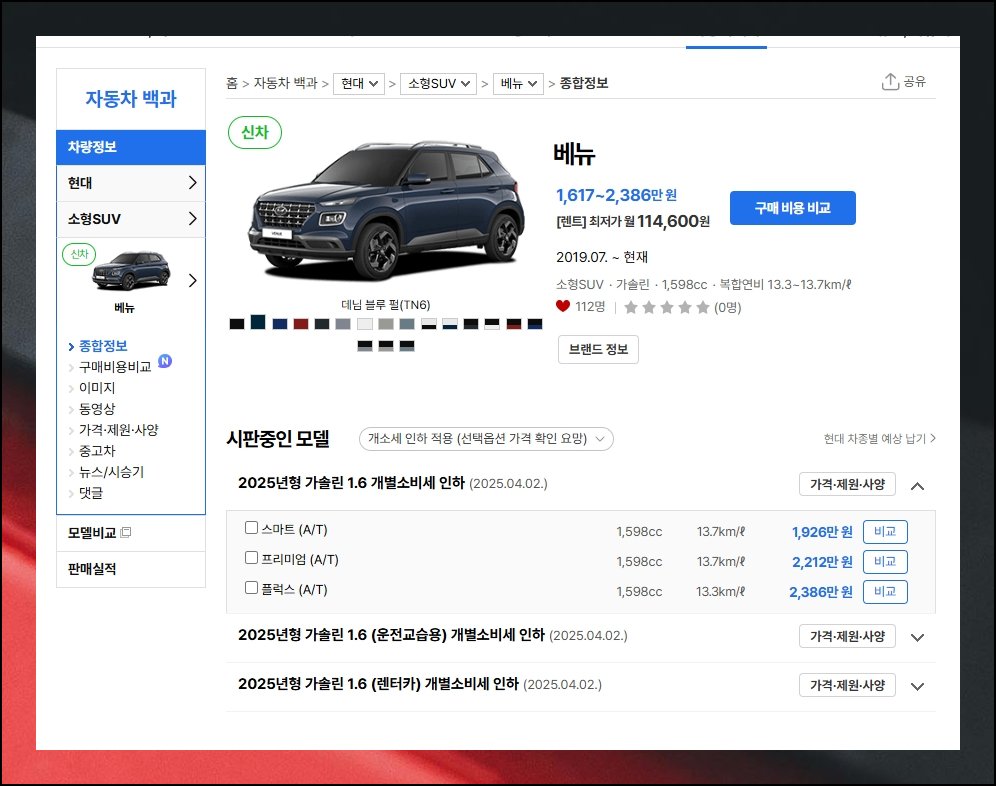 자동차를 새로 장만하려면 주요 비용을 사전에 숙지해야 해요. 베뉴 모델을 사례로 들어볼게요. 이번 달 적용되는 구매 혜택과 트림별 출고 금액을 간편하게 살펴볼 수 있습니다. 여기에 선택 옵션과 부대 비용을 더하면 실제 지불 금액이 산출돼요. 베뉴는 1,617만원에서 2,236만원 사이에서 최종 값이 형성됩니다. 본인에게 꼭 맞는 현대차 가격표 확인 노하우를 지금부터 풀어드릴게요.