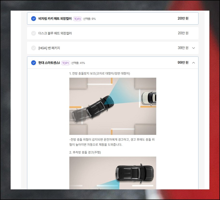 옵션 이름만 봐서는 어떤 역할을 하는 항목인지 감이 안 잡히는 경우가 많죠. 그럴 땐 금액 우측에 자리한 설명 버튼을 눌러주세요. 궁금했던 내용을 그 자리에서 곧바로 살펴볼 수 있습니다.