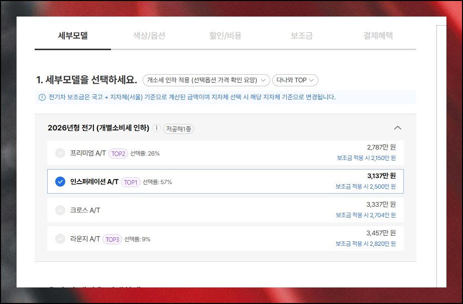 이 시점부터는 여러 항목을 스스로 지정하면서 현대차 실구매가를 자동으로 산출받는 흐름이에요. 가장 먼저 진행할 일은 본인이 원하는 트림을 확정 짓는 부분입니다.