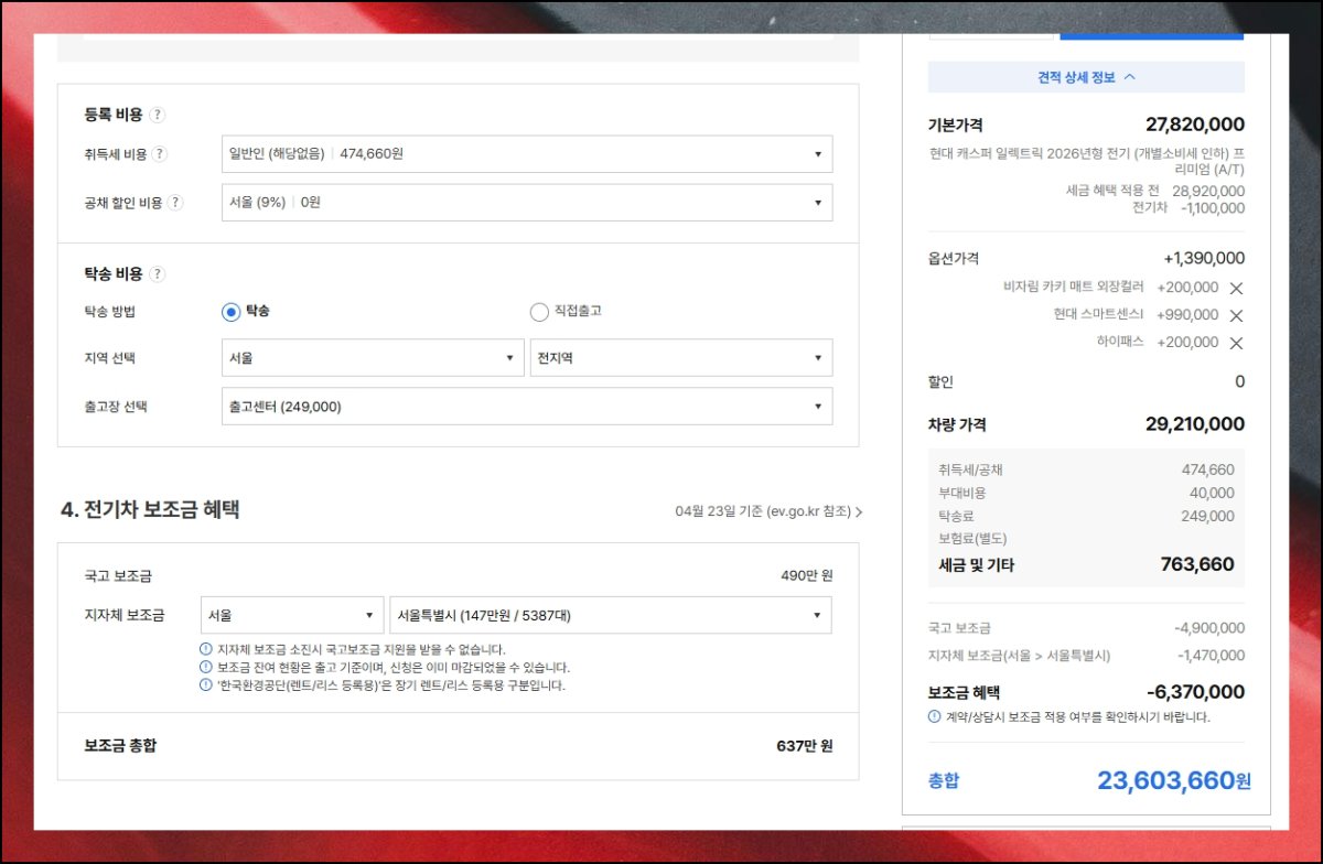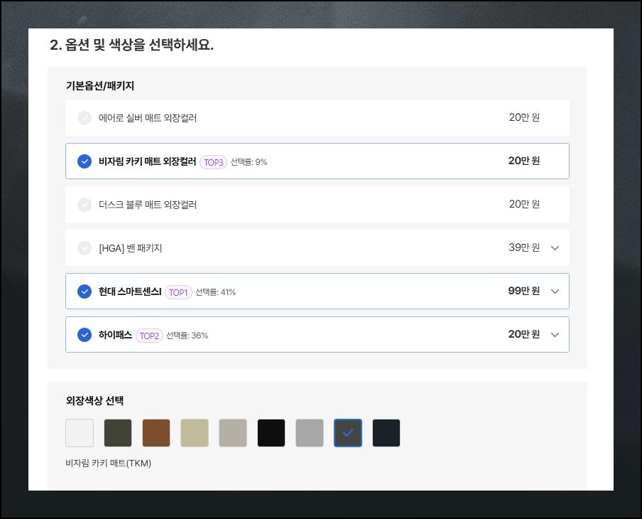 다음 단계에서는 캐스퍼에 입히고 싶은 컬러와 기능을 지정하는 순서예요. 선호와 더불어 실제 유용한 부분까지 종합적으로 따져보세요. 가격표를 나란히 놓고 살피면 현명한 판단이 가능합니다.