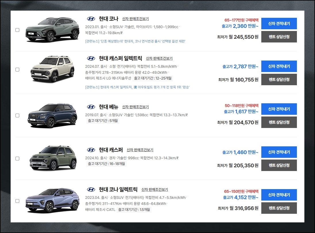 조건 입력을 마치면 결과 화면이 뜨게 됩니다. 현대차 중에서 경차와 소형차, 소형 SUV로 범위를 좁혔더니 인기 순위대로 5종이 줄줄이 나왔어요. 차량 이미지와 핵심 데이터가 짝을 이룬 형태로 보여집니다. 대략적인 제원과 요금 자료를 미리 눈도장 찍을 수 있어요.