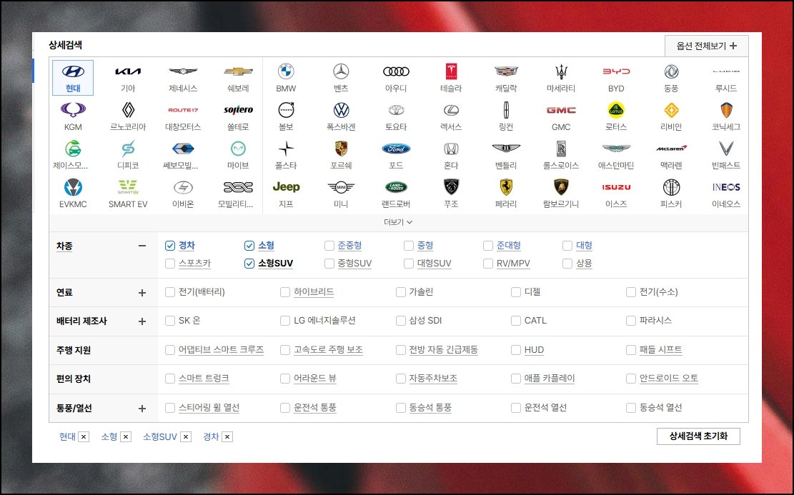 새로 뜨는 페이지에는 성향에 어울리는 현대차 모델을 걸러내는 도구들이 갖춰져 있어요. 상세 검색 메뉴에서 제조사부터 차종 분류, 연료 방식, 주행 보조 장치까지 섬세하게 지정할 수 있답니다.